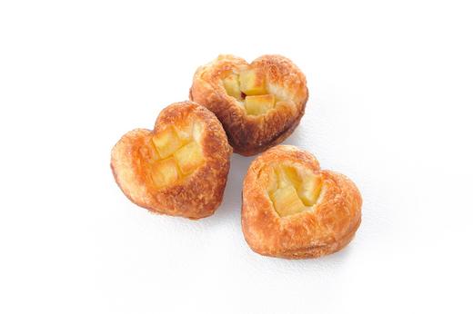 ハートのデニッシュ生地にりんごプレザーブをのせ、メープルパウダーをまぶして焼き上げました。