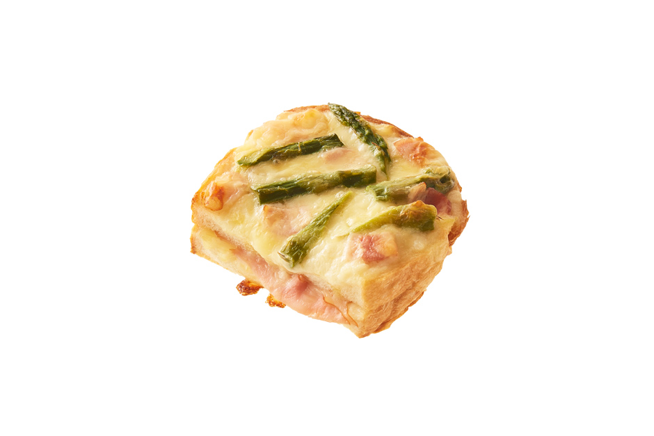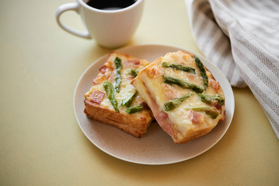 スライスしたイギリスパンで、グラタンソース、ポークシュゼットハム、ミックスチーズをはさみ、上にはアスパラガス、ベーコン、ミックスチーズをトッピング。仕上げにオリーブオイルを塗っています。