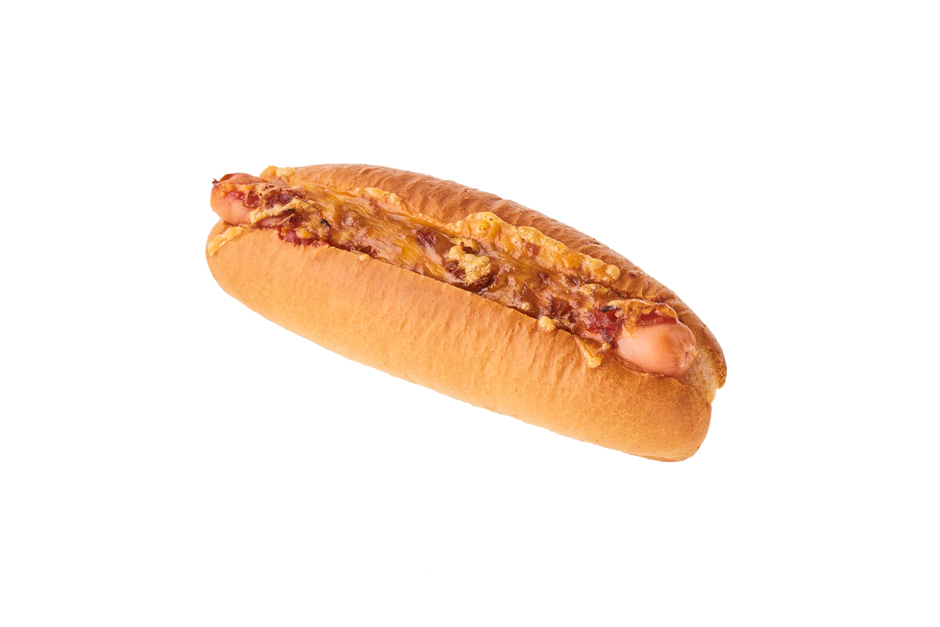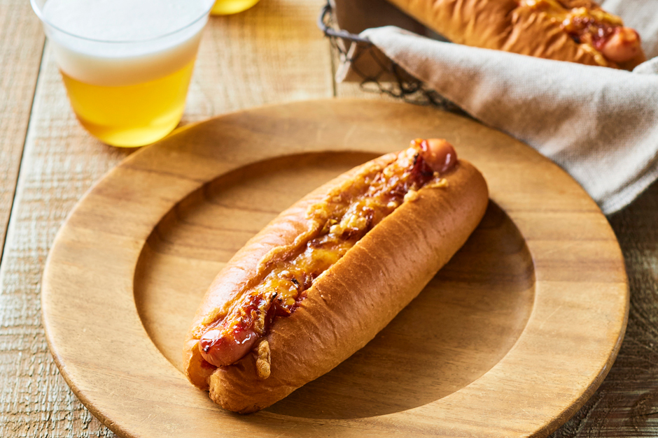 パンにトマトケチャップ、粒マスタード、(焼成した)デンマークソーセージを挟み、フライドオニオンをトッピング。レッドチェダーチーズをのせて焼き上げました。