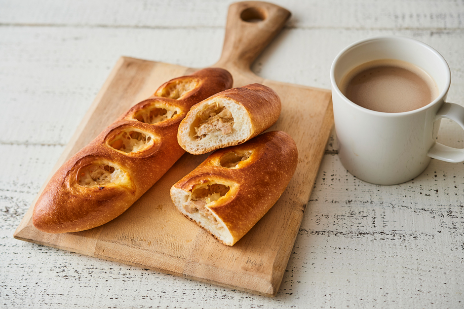 ツナとオニオン入りのフィリングとミックスチーズを包んで焼き上げ、仕上げにオリーブオイルを塗りました。
