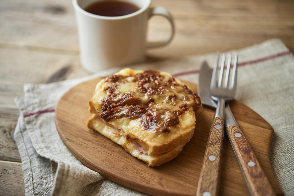 スライスしたイギリスパンで、グラタンソース、ポークシュゼットハム、ミックスチーズをはさみ、上にはミートソース、ミックスチーズをトッピング。仕上げにオリーブオイルを塗っています。