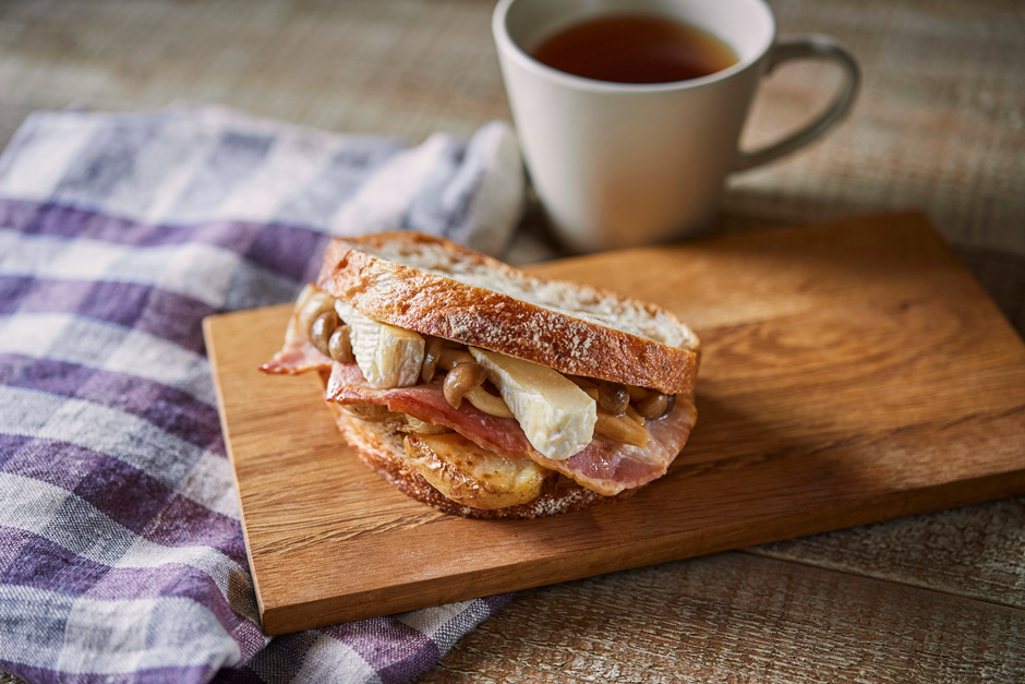 カマンベールチーズと黒酢ドレッシングでソテーしたぶなしめじ、スライスポテト、ベーコンをサンドし、マスタードソースで味付け。味のアクセントとして、パンの片側に粒マスタードを塗りました。軽くあたためてもおいしくお召し上がりいただけます。