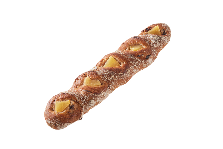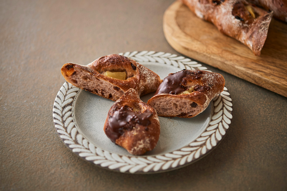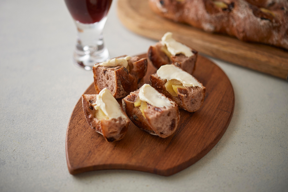 ライ麦粉、石臼挽き粉入りの生地に混ぜ込み、芸北りんごプレザーブ(シナノゴールド)をトッピングして焼き上げました。寒くなると北欧で飲まれるグリュック(ホットワイン)をイメージした香りと味わいに、芸北りんごプレザーブの優しい甘みが加わり、深みがありながらもフルーティな味わいが楽しめます。また、ドライフルーツやりんごプレザーブをスパイスが引き締めているので、お酒のおともにぴったり。