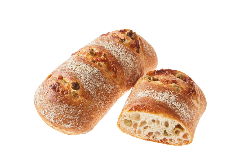 ファーマーズブレッド生地にグリーンオリーブとモッツァレラチーズを巻き込んで焼き上げました。