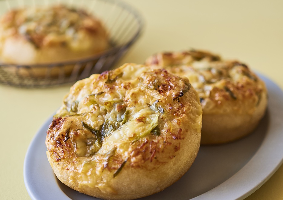 じゃがいも入りのファーマーズブレッド生地に、しらす入りのバターフィリングを絞り、ねぎとチーズをトッピングして焼き上げました。