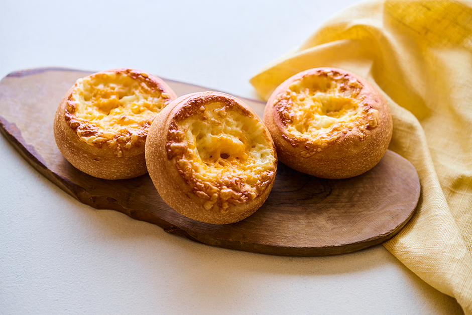 歯切れのよいイギリスパンの生地でミックスチーズを包み、チェダーチーズをトッピングして焼き上げました。