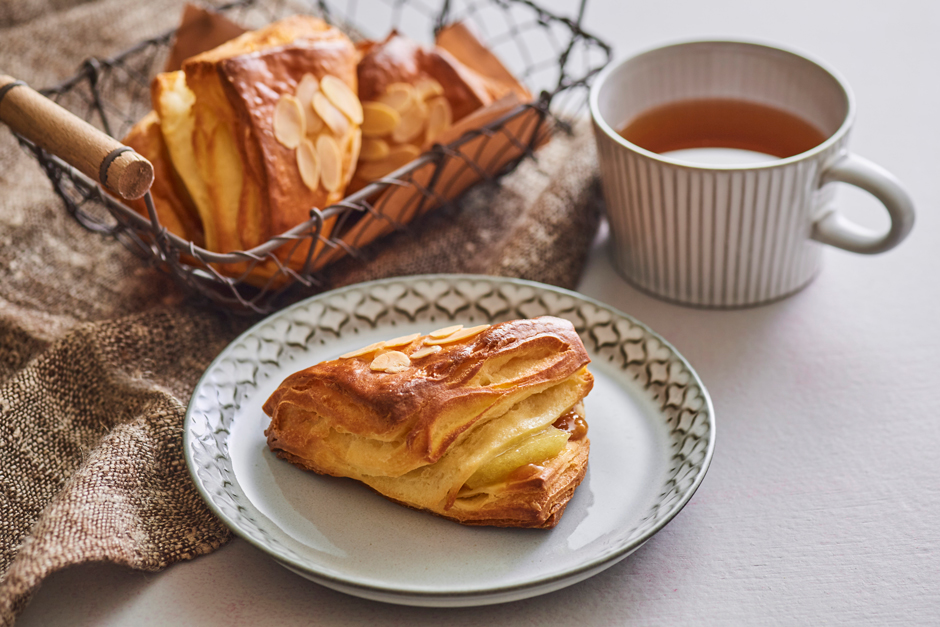 ザクザクとした食感が特長のデンマークスコーンにキャラメルフィリング、芸北りんごプレザーブ(グラニースミス)をはさみ、アーモンドスライスをトッピングして焼き上げました。