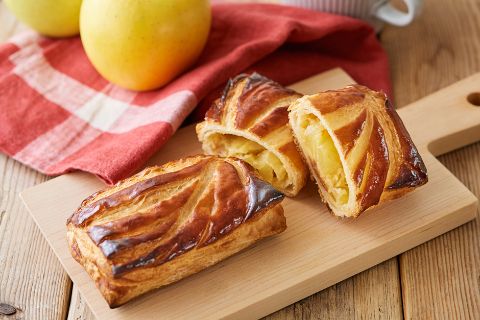 サクっとしたパイ生地にカスタードクリームなどと合わせた芸北りんごプレザーブ(シナノゴールド)、シフォンケーキを包んで焼き上げました。ジューシーでやさしい甘みのシナノゴールドのプレザーブがカスタードクリームと相性抜群。シナモンを使用していないので、りんごプレザーブの味わいをシンプルに楽しめます。