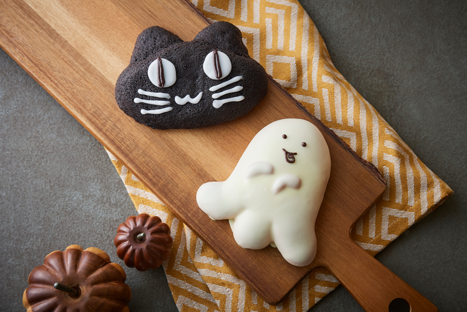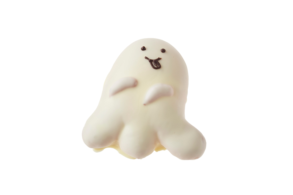 ふんわりやわらかい生地でカスタードクリームを包み、おばけの形に焼き上げました。おばけの手の部分は同じ生地を使用しています。仕上げにホワイトチョコでコーティングし、ココアグラスで目と口を描いています。かわいらしい表情が特長の商品です。