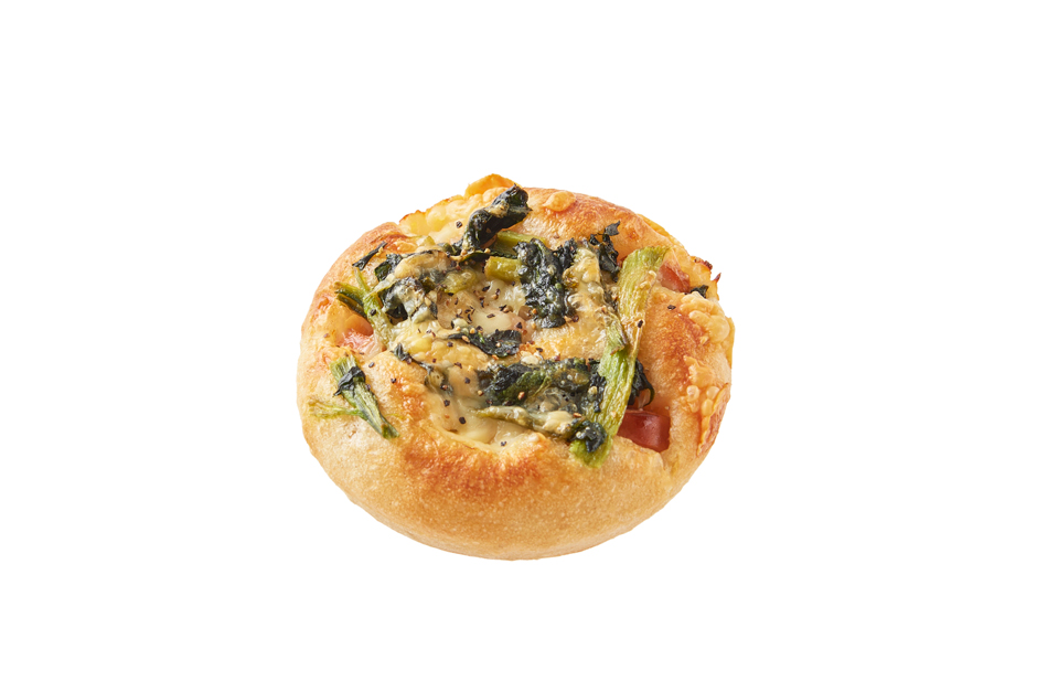 じゃがいも入りのファーマーズ生地に、バターフィリングと和えたほうれん草、ソーセージ、ミックスチーズを組み合わせました。仕上げにオリーブオイルをぬり、ブラックペッパーをふっています。