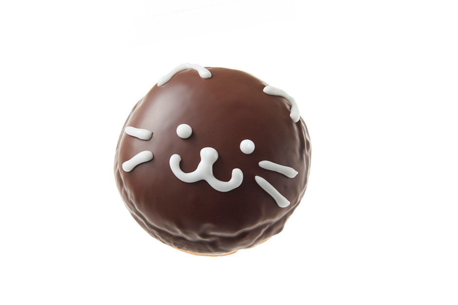 菓子パン生地にマジパンを包んで焼き上げ、生クリーム入りのカスタードクリームを絞り、チョコでコーティングしました。樽たたきのねこにちなみ、ねこの顔をデザインしています。