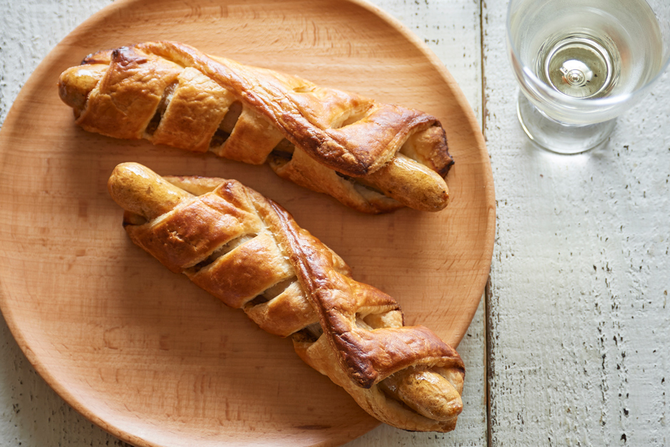 サクッとしたパイ生地で、香りが広がるハーブソーセージと粒マスタードを包みました。ハーブ香る爽やかなソーセージと、香ばしくコクのあるパイ生地がマッチ。粒マスタードの程よいスパイシーさが味のアクセントになっています。ランチはもちろんのこと、白ワインなどのお酒と合わせていただくのもおすすめです。