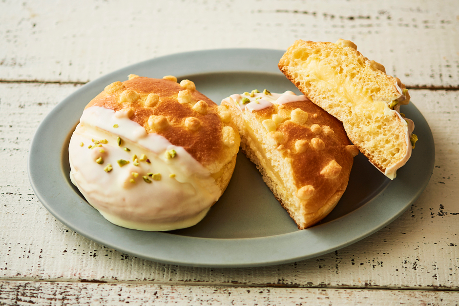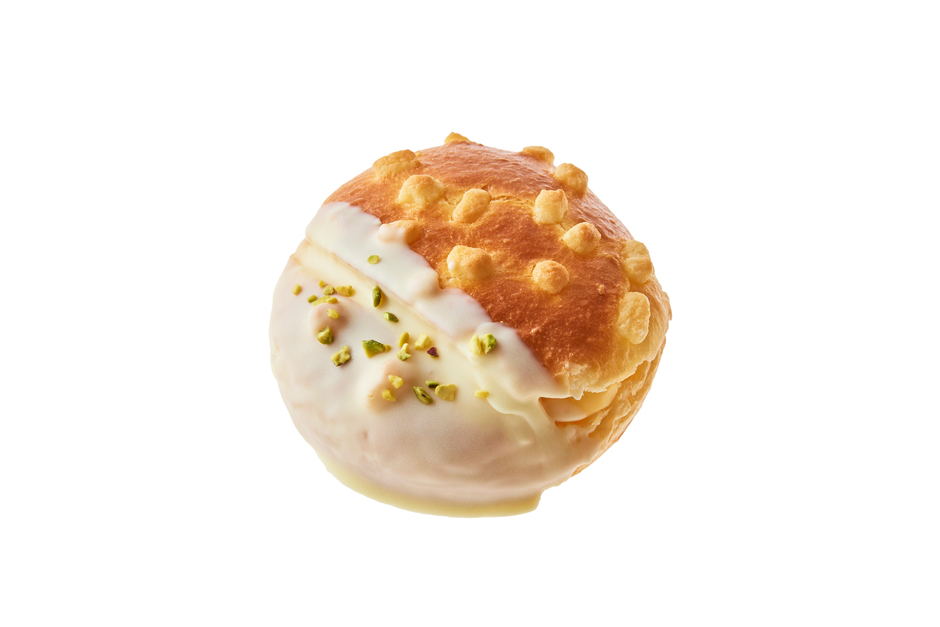 ブリオッシュ生地にそぼろをトッピングして焼き上げ、カスタードクリームを絞り、ホワイトチョコでコーティング。ピスタチオの小割で飾りました。
