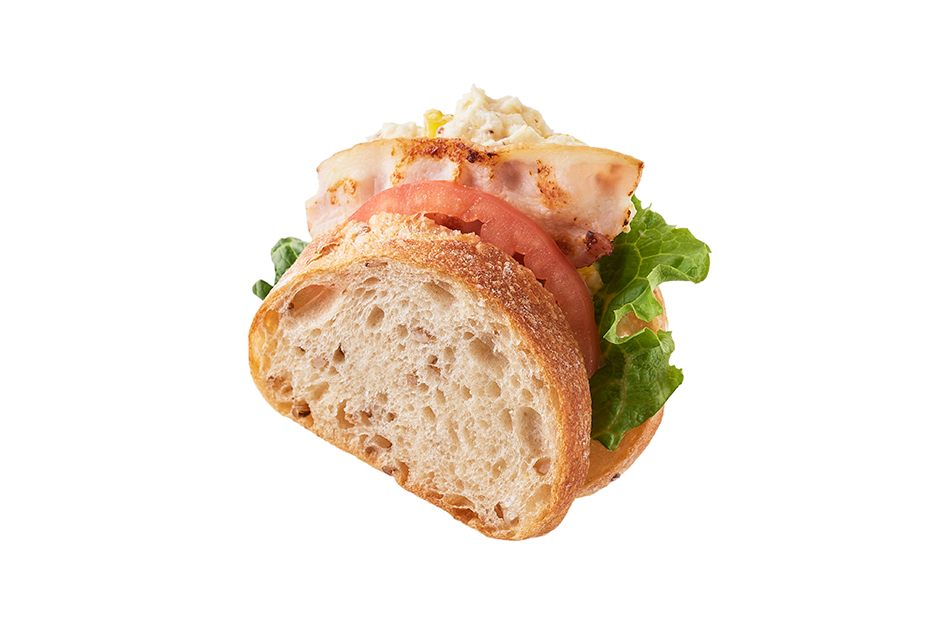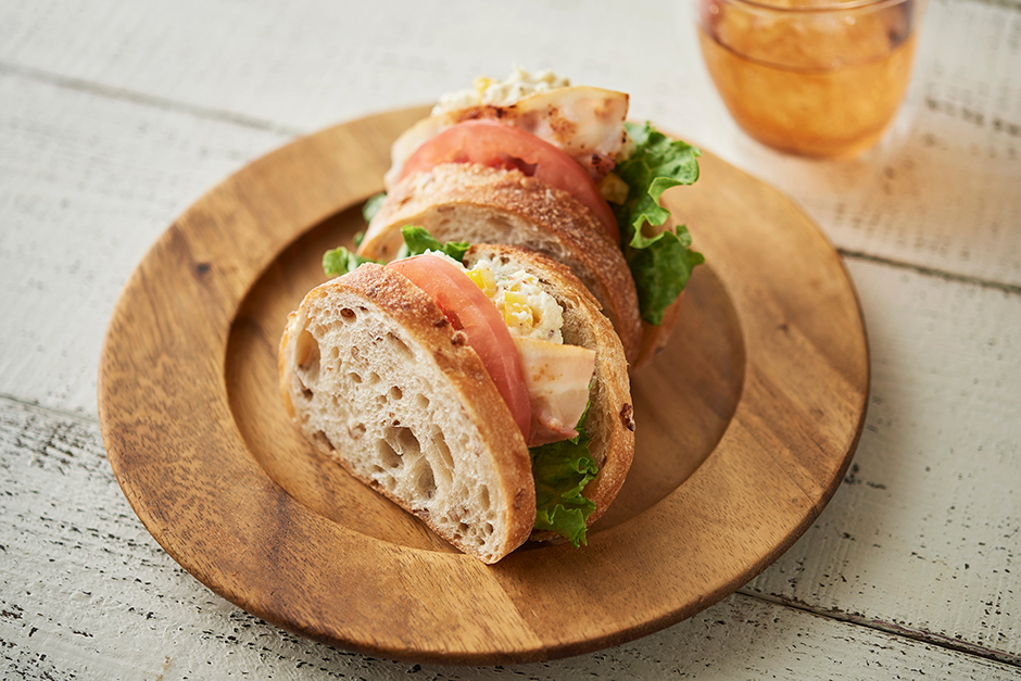 カットした黄パプリカと粒マスタード、はちみつ入りのポテトサラダとベーコン、トマト、グリーンカールをサンドしました。