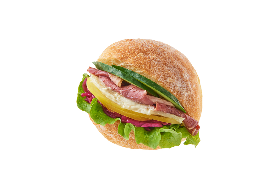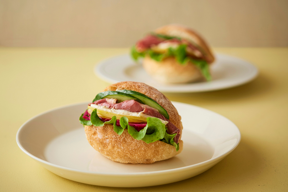 ハイジの白パンでグリーンカール、レッドキャベツとビーツのラべ、黄パプリカ、細切りポテトマスタードフィリング、パストラミビーフ、きゅうりを彩りよくサンドしました。見た目も食感も楽しい、春にぴったりのサンドイッチです。