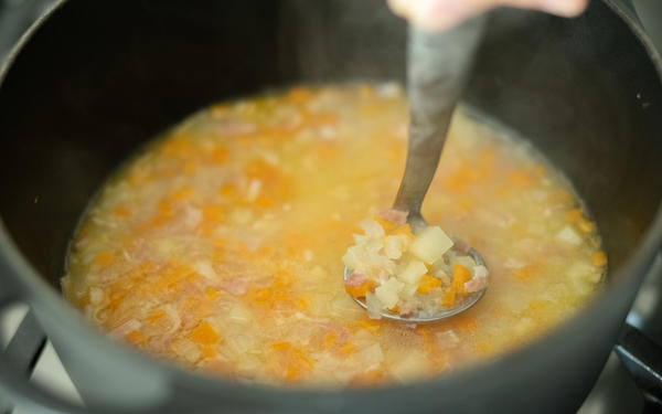 ファーマーズブレッドと一緒に楽しむポタージュスープ。お鍋の中で、野菜をつぶして簡単に作れます。ハーブはお好みのもので◎