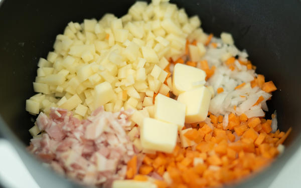 ①玉ねぎ、じゃがいも、にんじんの皮をむき、みじん切りにします。