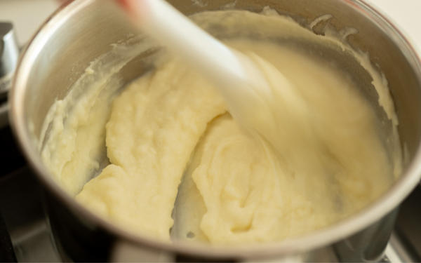 ③バターと塩を加え、弱火にかけながら牛乳を20mlずつ加え、その都度、混ぜます。