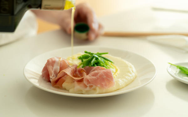 ①ピュレ状になったらお皿に盛り、生ハム、絹さやをのせてオリーブオイルをまわしかけ、レモンの皮をけずったら、できあがり。